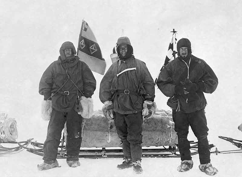 Members of the dejected Terra Nova exploration team explore Roald Amundsen’s tent at the South Pole on January 18, 1912—L-R: Scott, Oates, Wilson, Evans (Bowers behind the camera)