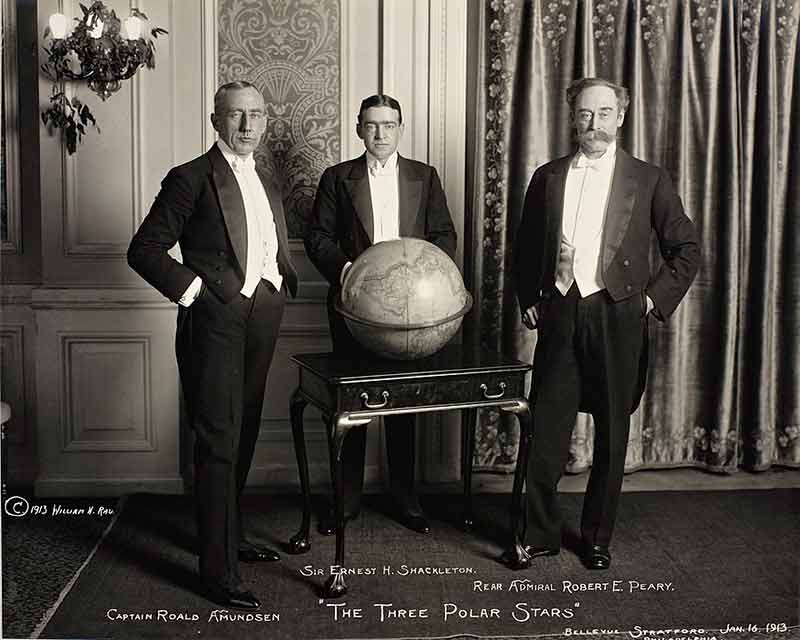 A photograph from 1913: The Three Polar Stars: Roald Amundsen (1872-1928), Ernest Henry Shackleton (1874-1922) and Robert Edwin Peary (1856-1920)